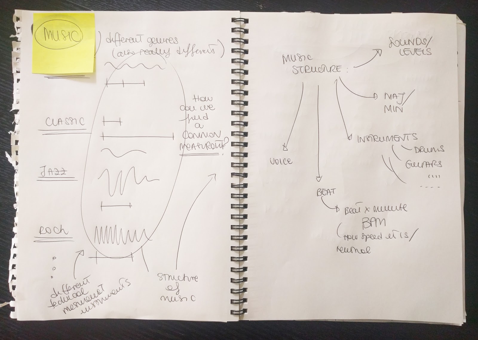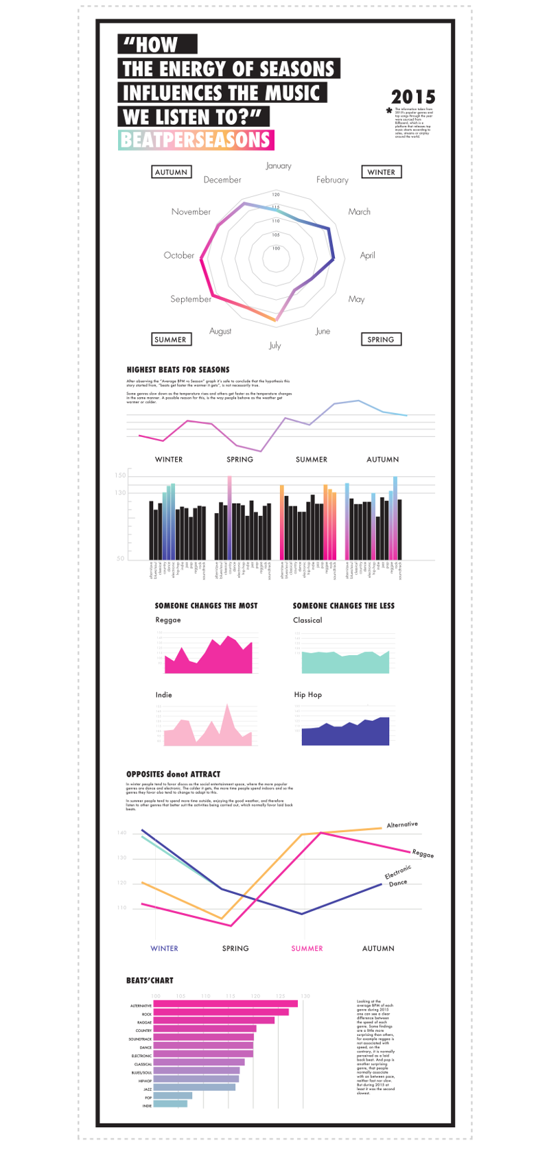 The initial question that got this project started was "How does the music we listen to change with the passage of time through different seasons in cycle (year)?". Based on this question, the first problem faced was how to find the common factor in different music genres and compare them to each other. Considering different aspects such as: the key of the song, the rhythm, frequency, instruments, the most flexible and easier aspect to interact with was beat per minute average (BPM) of a song, as it came to be the most relevant. This feature can be used to compare genres, for example classical and electronic. The former, is very conservative genre with stiff and well developed grammatical structure, the latter has a more hands on approach and a very flexible writing structure. Comparing this two extremely different genres would be very difficult using other criteria, because it would require a strong musical background and the result ?would have been very hard to be visualized in a clear and engaging manner.