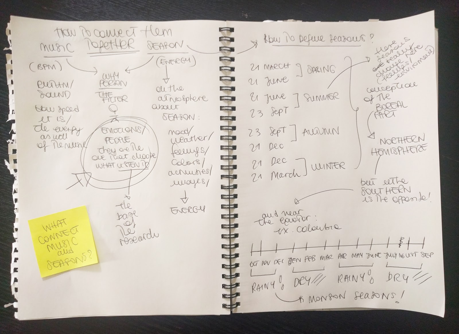 After selecting music and seasons as the main subjects for comparison, each one was deeply analyzed to see what could be relevant to our main question. BPM was selected as the measurement tool, but the link between music and season still was missing. In order to find the possible connections, seasons were broken down into pieces. Seasons are composed of emotions, moods, weather, feelings, atmosphere, activities, colors and images.